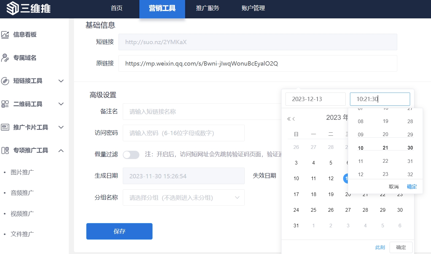 三维推短链接,支持在已发送的短链接不变的情况下,随时替换新的长链接,避免出现短链接受长链接影响无法正常打开而造成推广损失,还可设置有效期,支持永久有效,且操作简单,便捷高效,一次生成,永久可用,提高运营工作效率,降低企业推广成本。