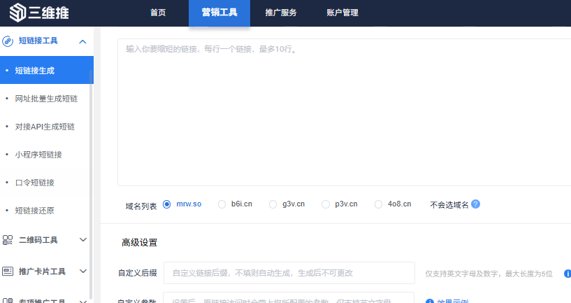 三维推,支持短链接单条、多条、批量、api生成,支持在已发送的短链接不变的情况下,随时替换新的长链接,避免出现短链接受长链接影响无法正常打开而造成推广损失,还可设置有效期,支持永久有效,且操作简单,便捷高效,一次生成,永久可用,提高运营工作效率,降低企业推广成本。
