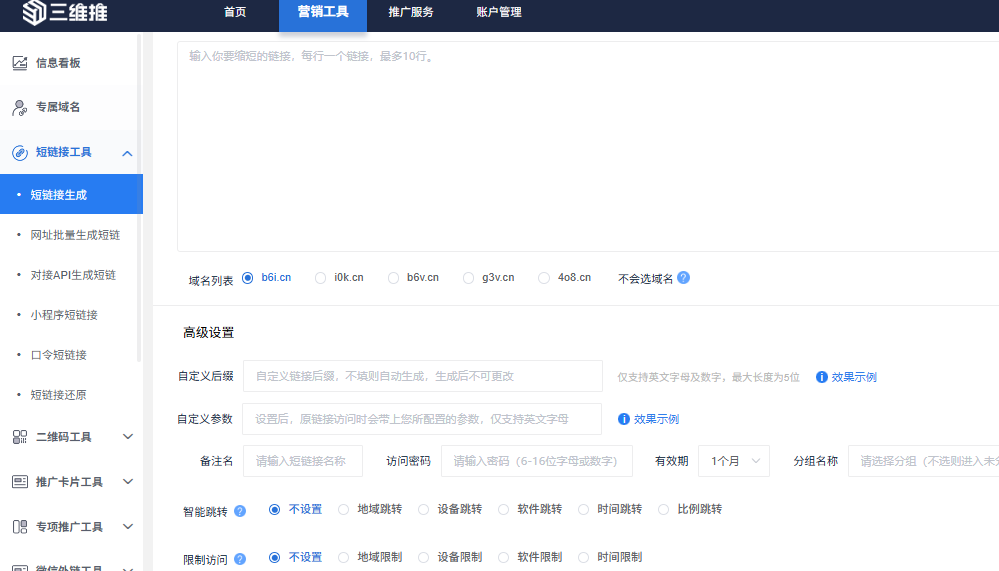 三维推短链接支持将长链接通过在线生成或多条生成方式来生成不同的短链接,且支持在已推广出去的短链接不变的情况下,随时替换新的长链接,避免出现短链接受长链接影响无法正常打开,造成推广损失,还可设置有效期,支持永久有效,或到期不可见,且操作简单,便捷高效,一次生成,永久可用,提高运营工作效率。