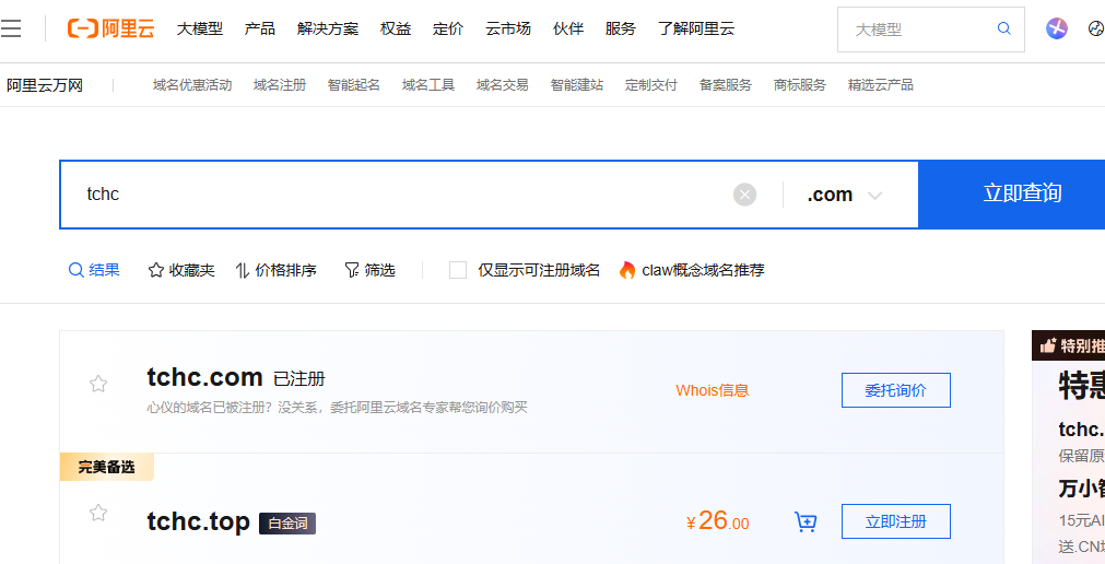 购买域名:在阿里云、腾讯云等域名服务商购买。普通域名费用非常便宜,三位数.cn域名约几百元/年。