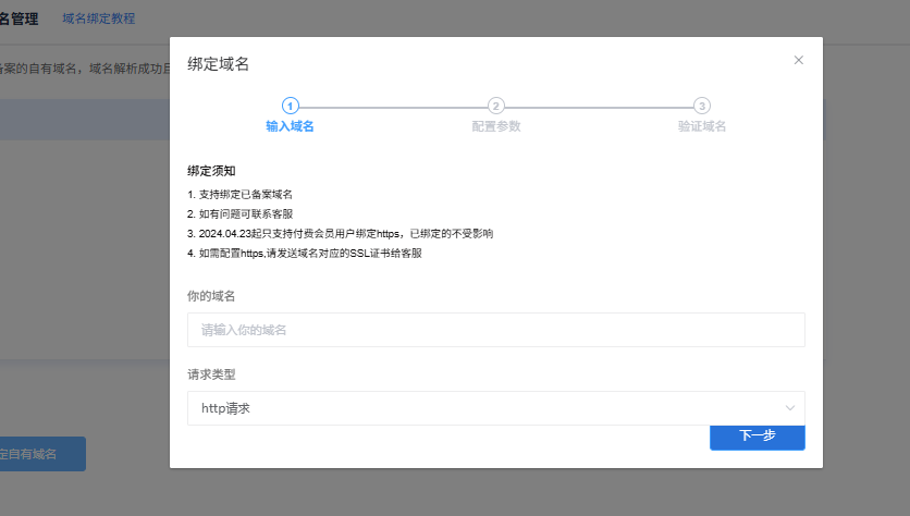 输入您已购买并在工信部备案的域名(如yourbrand.com),点击下一步。