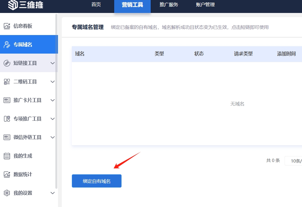 登录三维推官网(3wt.cn),在控制台中找到【专属域名】,点击【绑定自有域名】。