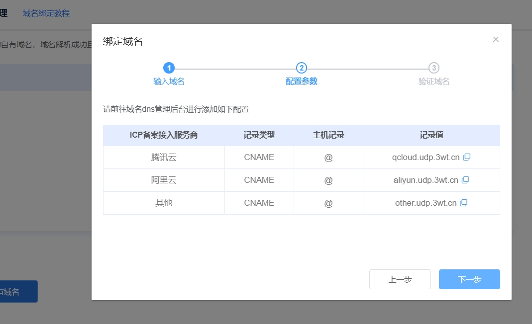 三维推会提供需要配置的记录类型、主机记录和记录值。您只需登录域名提供商后台(如阿里云、腾讯云、GoDaddy等),添加一条解析记录即可。