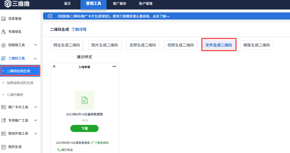 电脑端打开三维推官网(https://3wt.cn/),左侧栏找到【二维码工具】中的【二维码在线生成】,点击【文件生成二维码】。