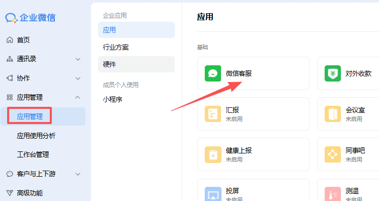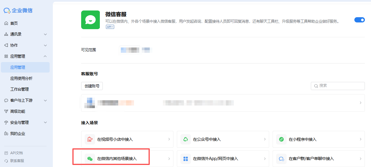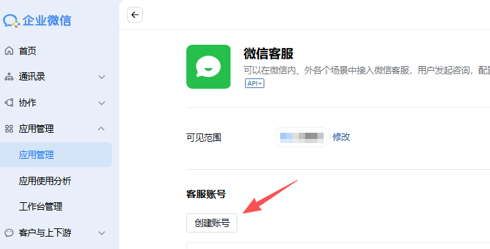 左侧【应用管理】-【应用管理】,点击【微信客服】,开启微信客服功能,根据需求设置“可见范围”,“管理权限”后期可以根据需求修改。