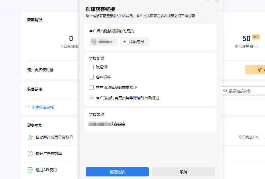 成功添加1位客户计1次使用量。如果客户和成员本身已经是好友关系,成员被设置在获客链接中,链接中有多个成员的情况下,客户点击这个链接会一直匹配到这个已经是好友关系的成员,因为之前已经是好友关系,这种情况不会消耗使用量。