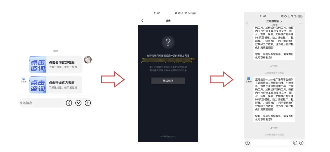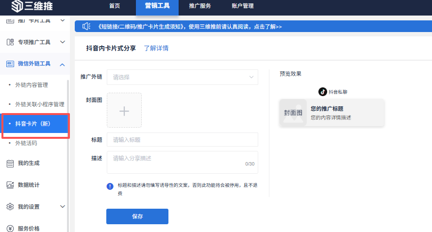 如果你想要实现“点击抖音卡片跳转添加个人微信”的效果,可以使用我们三维推的【微信外链工具】-【抖音卡片(新)】,操作中有问题可咨询客服。