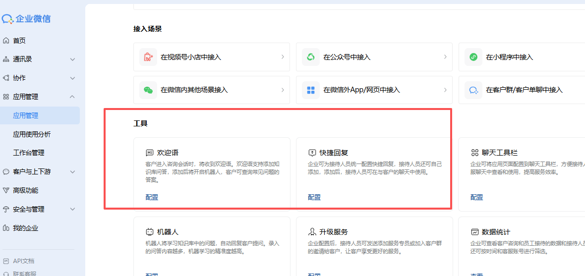 我们还可以根据需求设置企微客服的欢迎语、快捷回复等,提升客服接待效率。